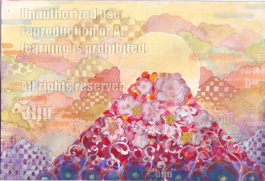 繫栄の願い(和柄:梅 唐草模様)をちりばめた富士山です。